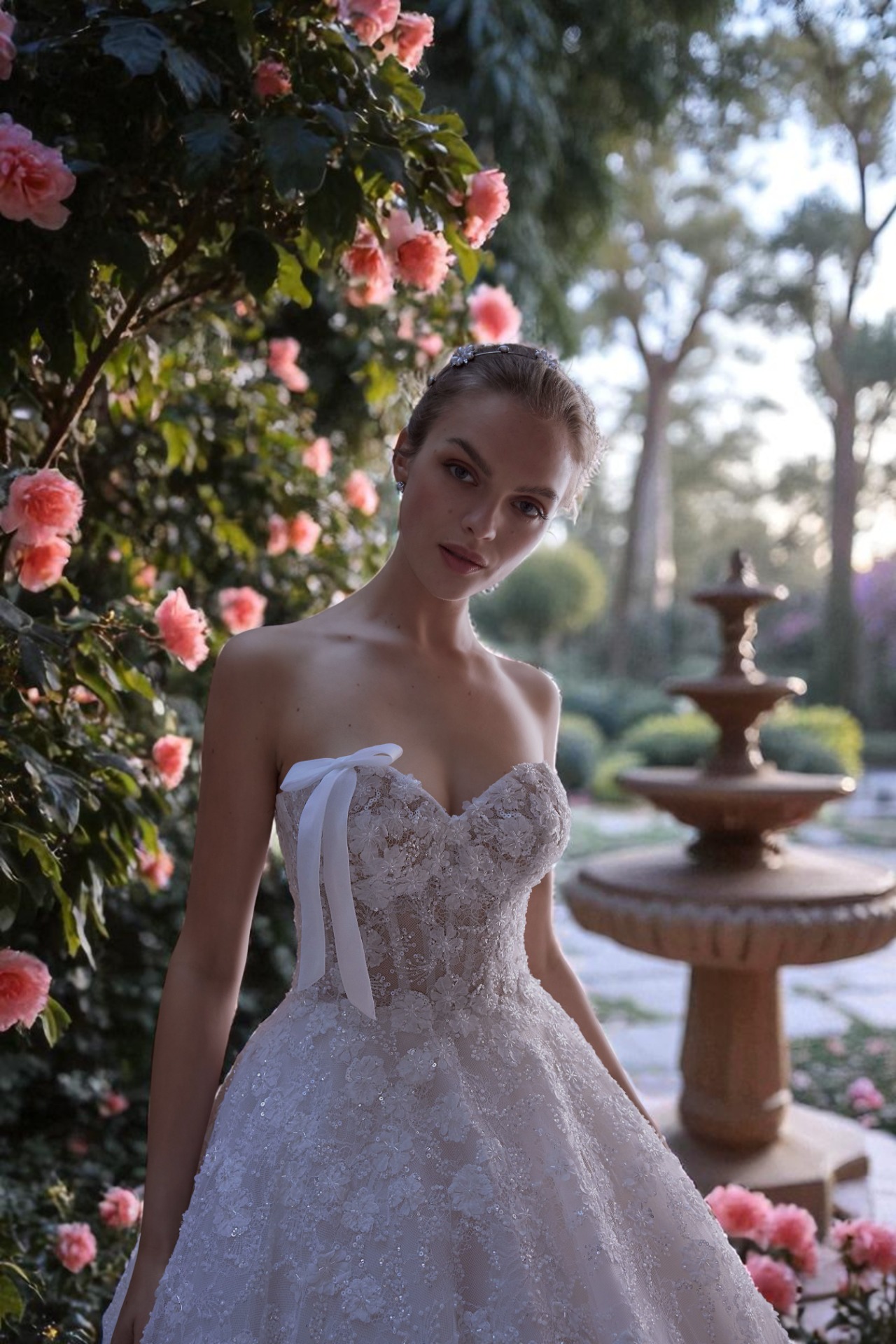 Se il tuo sogno è quello di sentirti una vera principessa nel giorno più bello, l'abito Sofia è la scelta perfetta. Disponibile da Fiore Sposa sulla circonvallazione di Monreale, questo abito ti farà brillare come mai prima d'ora. Sofia è un magnifico abito da sposa a ball gown, caratterizzato da una gonna voluminosa e maestosa che cattura l'attenzione e crea un'aura di pura magia. L'intero vestito è una nuvola di tulle e pizzo scintillante, ricamato con motivi floreali che sembrano ricoperti di rugiada, grazie a una miriade di cristalli e glitter sapientemente distribuiti. Ogni movimento fa brillare l'abito, garantendoti un'entrata memorabile e un effetto da favola per tutta la giornata. Il corpetto, con la sua elegante scollatura a cuore, esalta delicatamente il décolleté. Un tocco di modernità e dolcezza è dato dalle sottili bretelline in raso bianco che si annodano morbidamente sulle spalle, aggiungendo un dettaglio unico e femminile. La schiena, discretamente scollata, completa il look con una grazia senza tempo. Sofia è l'abito ideale per la sposa che desidera un look principesco e al tempo stesso romantico, un abito che le permetta di sentirsi la protagonista di una vera favola.