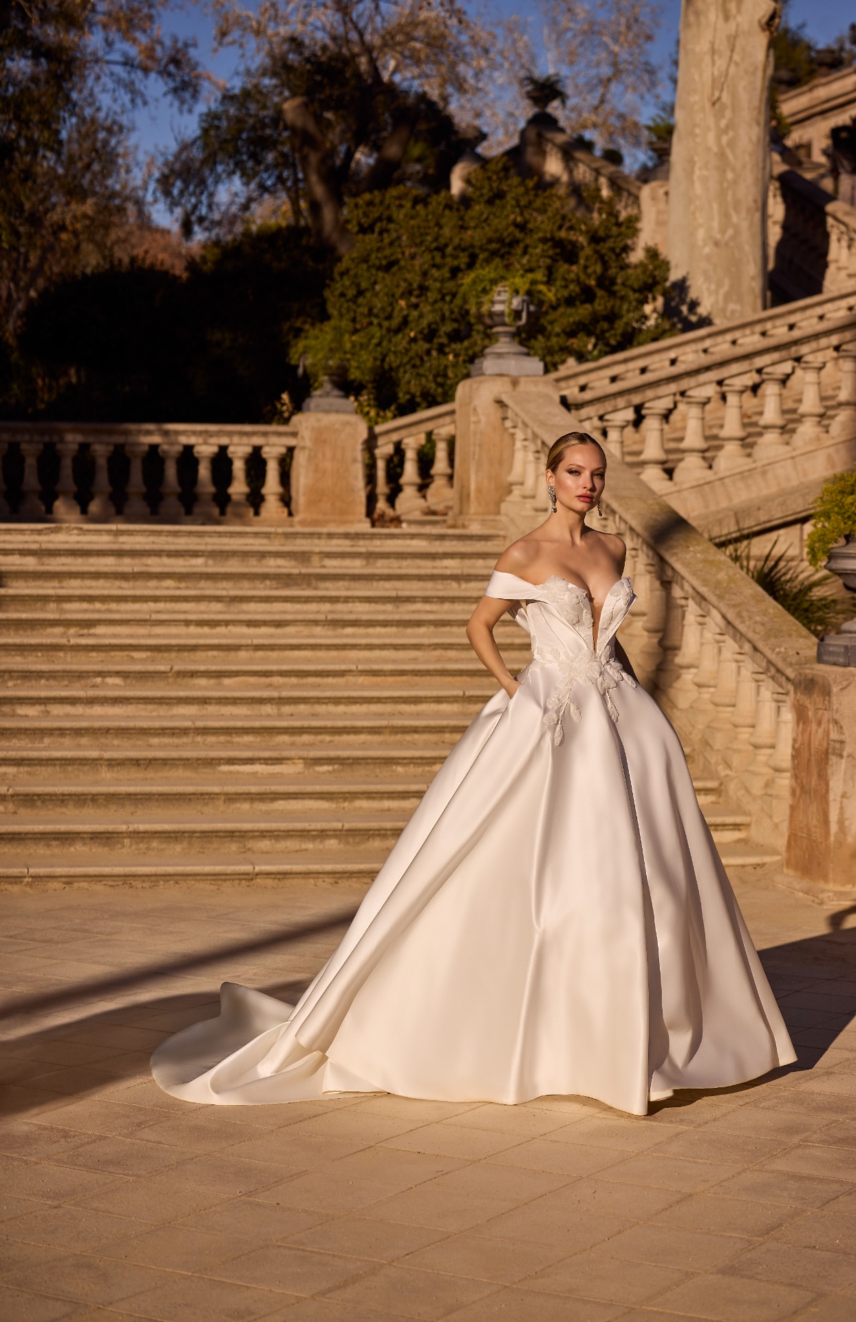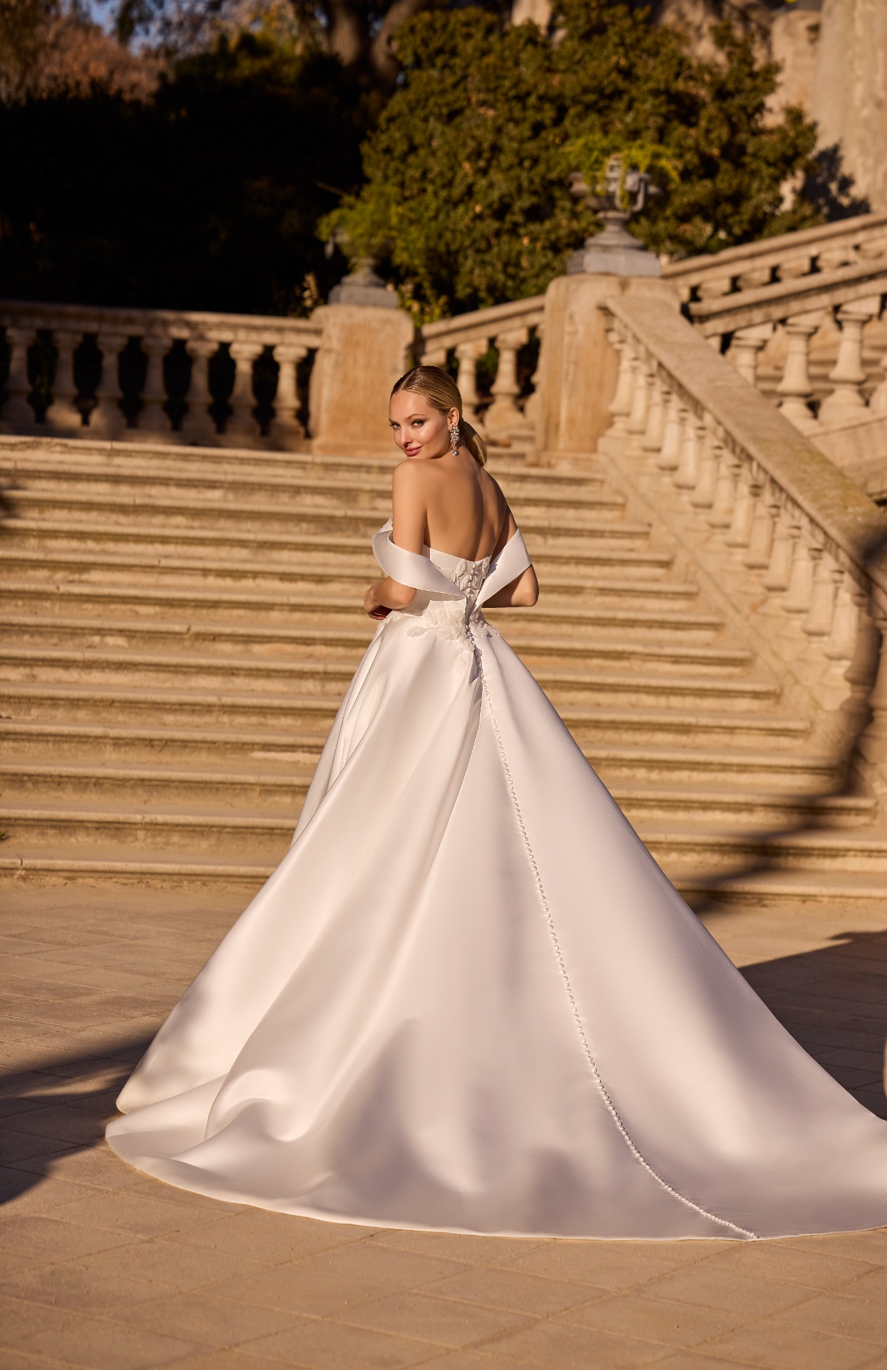 Preparati a sentirti una vera regina nel giorno più bello della tua vita con Vittoria, l'abito che unisce l'eleganza classica a dettagli sorprendentemente moderni. Questo abito da sposa, dal taglio a trapezio, è realizzato in un tessuto satinato di alta qualità che scivola con grazia ad ogni tuo passo, illuminando il tuo look. Il punto forte di questo vestito è il corpetto strutturato con scollo a cuore e spalline scoperte, che valorizza con sensualità e raffinatezza il tuo décolleté. Dettagli floreali tridimensionali, realizzati con lo stesso tessuto dell'abito, aggiungono un tocco romantico e delicato che si estende in modo sinuoso dal corpetto fino alla vita. E per un tocco di glamour in più, la profonda scollatura centrale è decorata da un inserto in tulle semitrasparente. Sul retro, l'allacciatura con un intreccio di lacci sottili e la gonna che si apre con grazia sono un vero spettacolo. Ma la vera sorpresa sono le due file di perline che scendono lungo il retro della gonna e le comodissime tasche nascoste, perfette per tenere a portata di mano tutto ciò di cui hai bisogno. Vieni a provare la bellezza e il comfort di Vittoria nel nostro atelier Fiore Sposa, in Via Circonvallazione 13 a Monreale, Palermo.